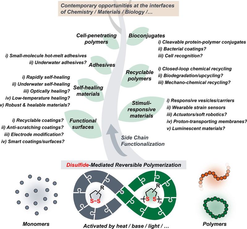 该文章以“动态二硫可逆开环聚合”为切入点,首先回顾了poly(disulfide)s这类聚合物自上世纪50年代被首次发现以来,在聚合物合成方法学上的重要事件,从最初的分子量不可控的氧化聚合、光化学聚合、热聚合方法,再到近年来国内外同行连续取得进展的硫醇阴离子引发的可控开环聚合。这些基础研究成果奠定了poly(disulfide)s的聚合方法学,使得这类动态聚合物的可控制备成为可能。