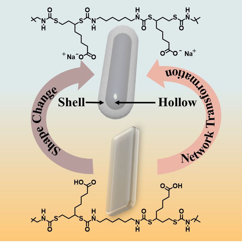 空心结构在帮助有机生命体生理功能正常运转上起到必不可少的作用。目前,构筑自演化空心聚合物的初始材料通常为水凝胶,但其湿润、机械强度差等特性一定程度上阻碍了该类材料的实际应用。近日,我校化学学院、费林加诺贝尔奖科学家联合研究中心曲大辉教授课题组报道了一种以高机械性能的干网络聚硫氨酯热固性材料在碱性溶液中自演化为规整的空心结构新策略。该聚合物网络内交联结构的转化能够诱导聚合物薄膜形状发生改变,实现了微观结构调控促使宏观形状转变。该研究成果以“Self-Evolution of High Mechanical Strength Dry-Network PolythiourethaneThermosets into Neat Macroscopic Hollow Structures”为题发表在《德国应用化学》(2022, DOI: 10.1002/anie. 202117195)。