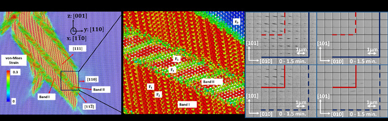 由于硅的马氏体相变具有很高的各向异性,硅的马氏体相变并不遵循经典的晶体学理论方程。研究发现硅在高压下,由大变形的Si I和Si II的第三变量结合组成的纳米条带通过{111}面和基体的Si I结构构成了新的马氏体相变结构。通过大变形马氏体相变理论推导,可以发现这种结构最小化了界面不匹配度,从而降低了系统整体的变形能。通过不含位错的硅试样的原位X射线衍射实验,实验过程中并没有发现孪晶条带和大变形Si I。但通过预置位错的Si试样,可以同时发现孪晶条带和大变形Si I条带的出现。分子动力学模拟和原位X射线衍射实验互相验证了这种新的马氏体相变结构。