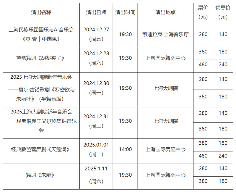 在辞旧迎新之际,为更好地满足师生欣赏高雅艺术的需求,党委宣传部(文明办)经多方沟通联系,于近期引进上海民族乐团国乐与AI音乐会《零·壹|中国色》、芭蕾舞剧《胡桃夹子》《天鹅湖》、2025上海大剧院新年音乐会——夏尔·古诺歌剧《罗密欧与朱丽叶》《经典浪漫主义歌剧集锦音乐会》、舞剧《朱鹮》共6场演出。请需要购票的师生携带校园卡、学生证或工作证到党委宣传部办公室购买,每人每场限购3张,数量有限,先到先得。